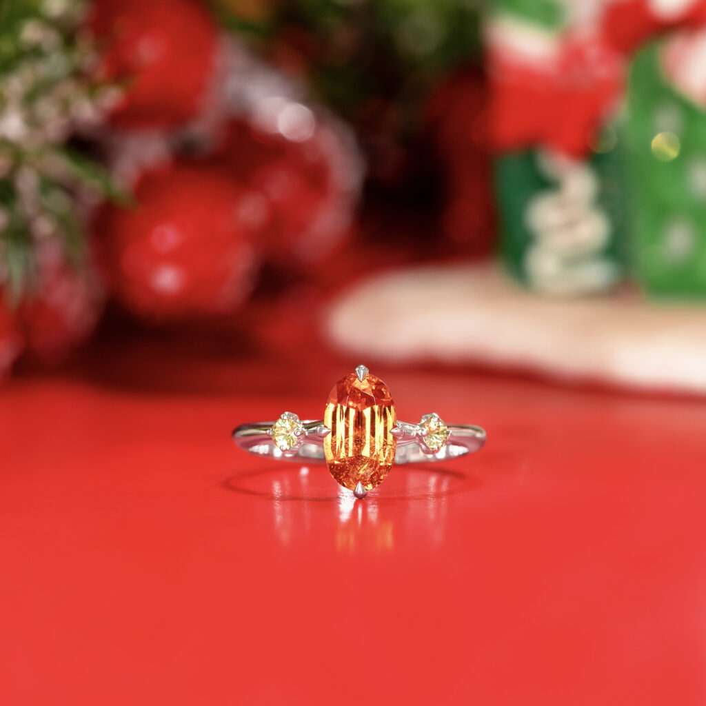 We wanted to showcase our craftsmen’s expert technique and craftsmanship by having the Mandarin Garnet bezel-set into the custom-cut white Quartz, thus making it appear to float in mid-air.