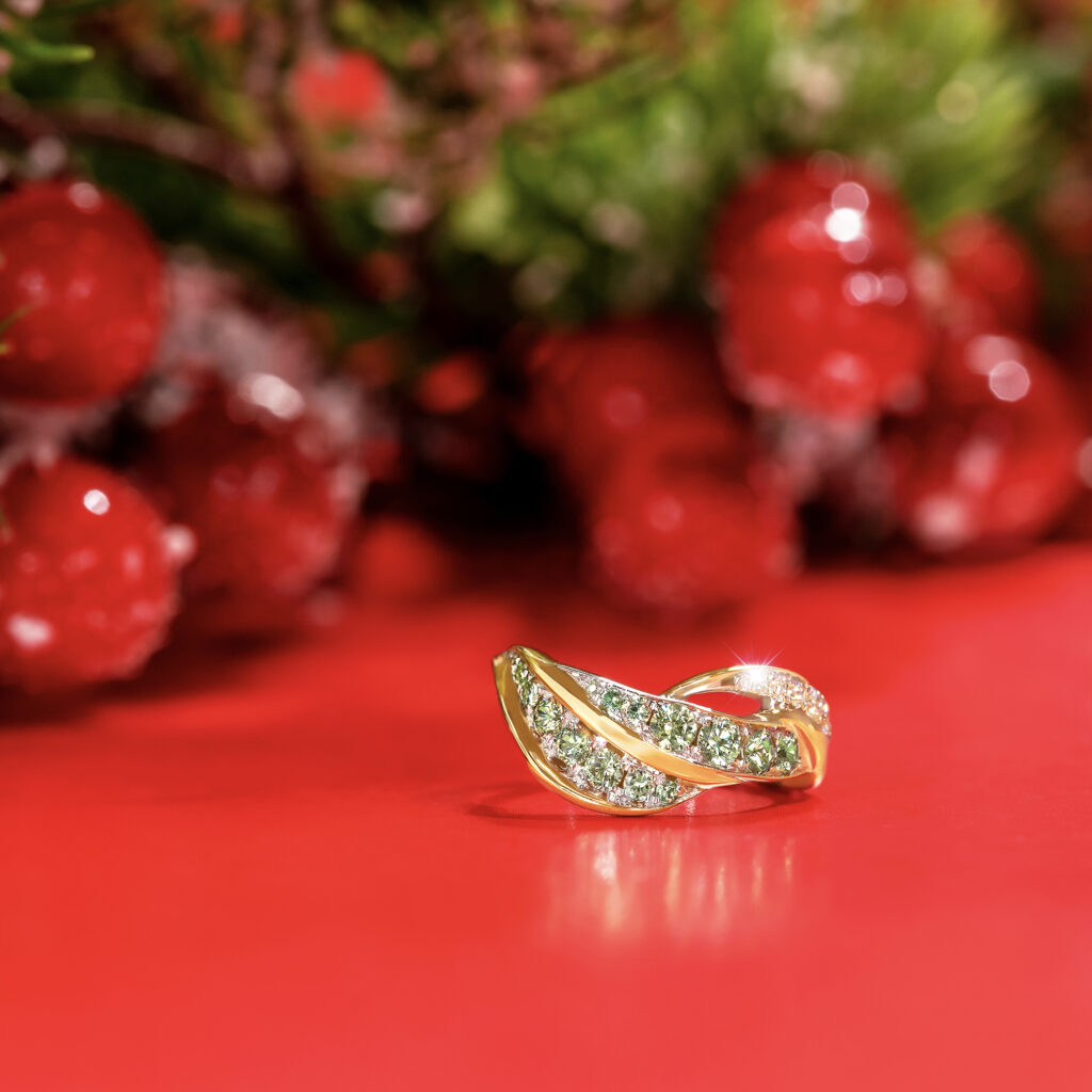 A wavy band with lots of swirls and twirls, a sweet pink Sapphire and pops of Paraiba! A fun and underrated colour combination toes the line between whimsical and charming, but is sure to dazzle and delight!